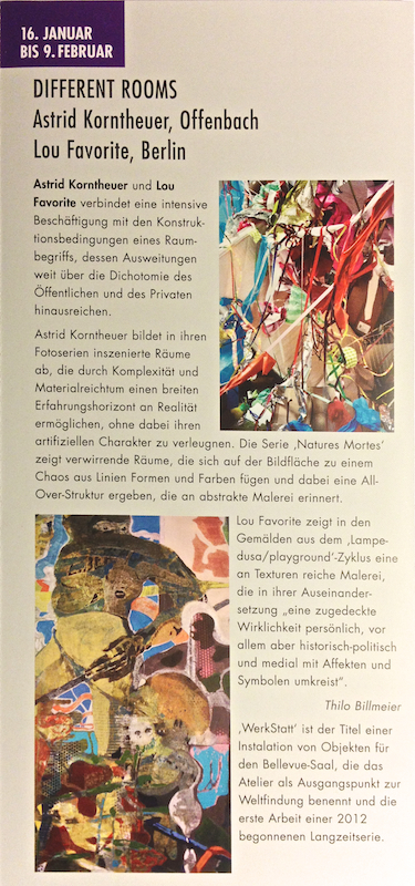 nächste Ausstellung: Kunstverein Bellevue-Saal, Wiesbaden 16.01 - 09. 02 2014 Astrid Korntheuer (Offenbach), Lou Favorite (Berlin)